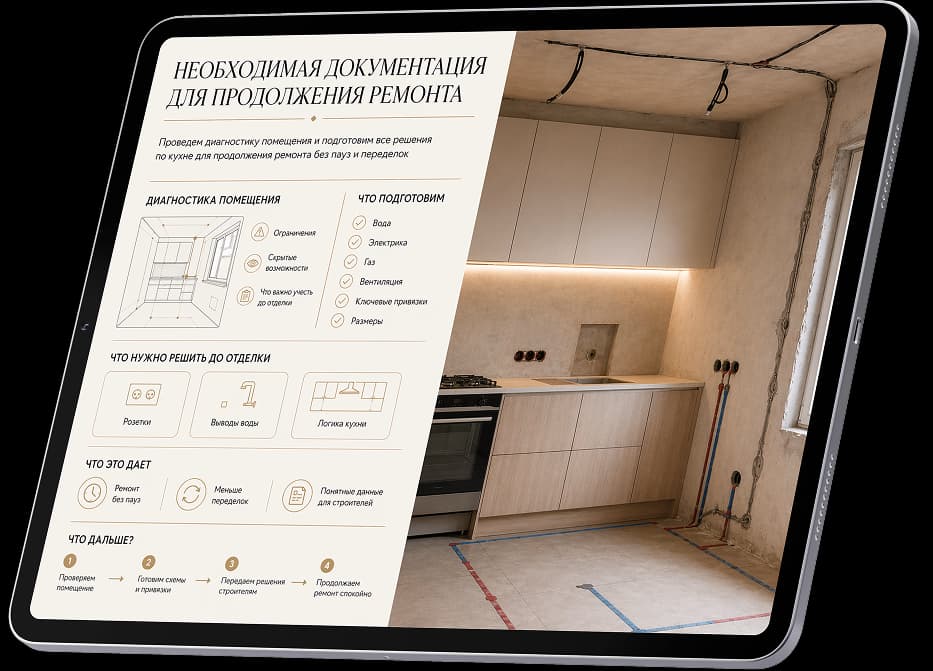 Подготовим схемы и решения по кухне, чтобы строители продолжили работу без пауз и переделок